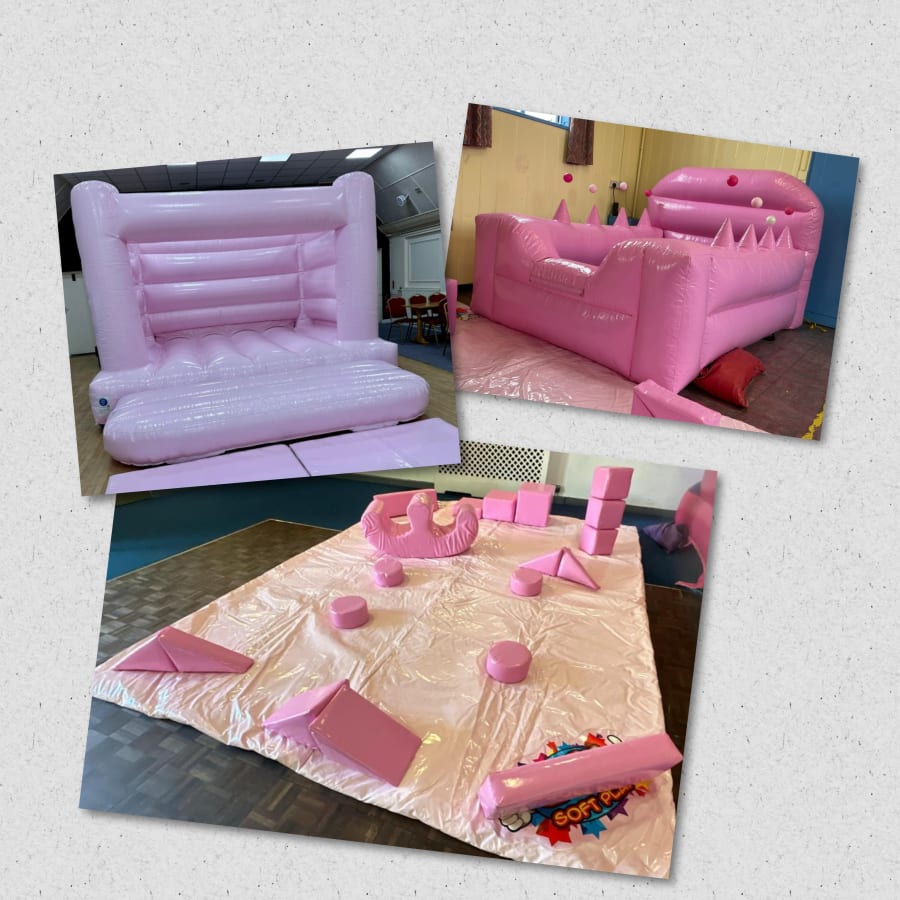 Pastel pink soft play package with a air juggler ball pond and a choice of castle