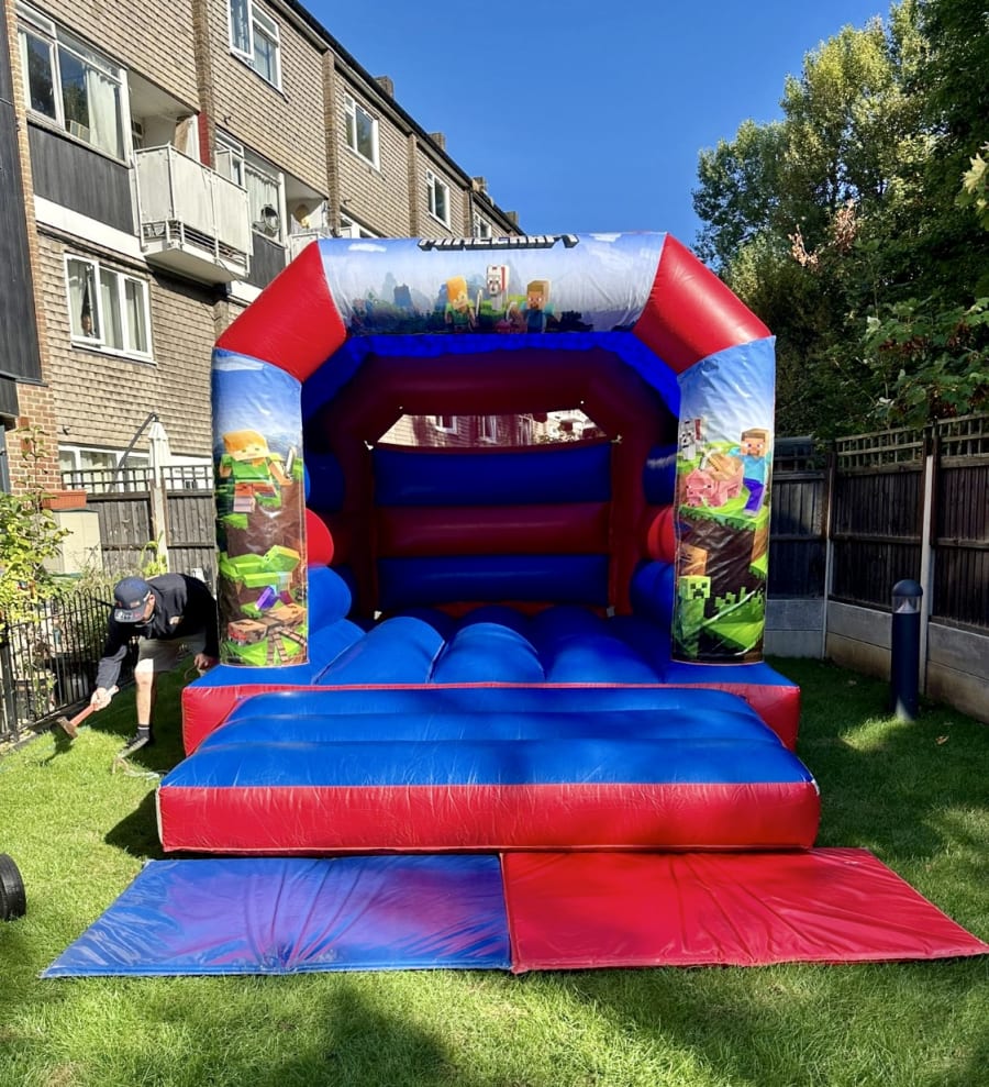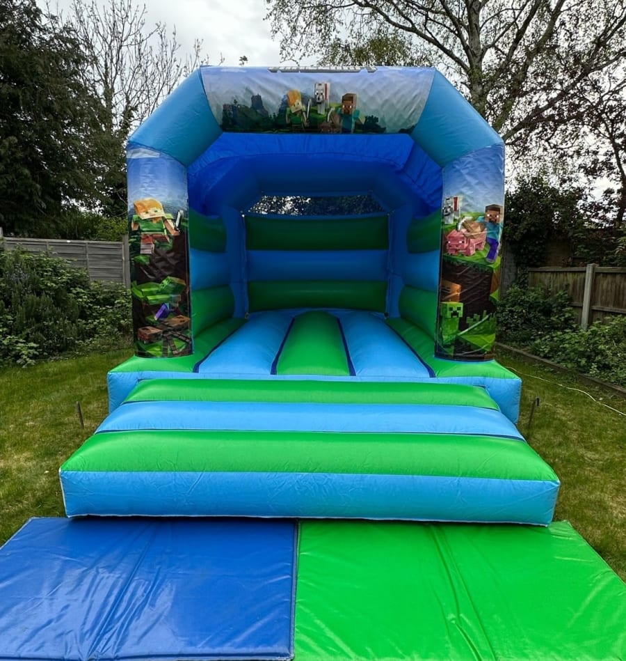 Our Minecraft Bouncy Castles come in an exciting selection of colours, including Blue, Navy & Red, Pink & Purple, Green & Blue, Red & Blue, and Orange & Navy. Each inflatable measures a generous 12ft wide by 15ft long and stands at a height of 9.5ft, comfortably accommodating up to six children aged 10 years or younger, depending on their height and age.