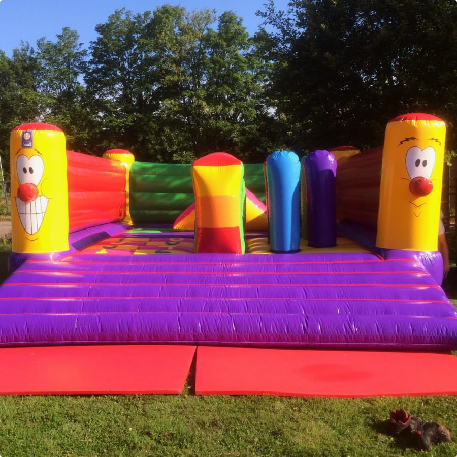 When hiring, we provide an electric blower, extension lead, and necessary safety equipment. The inflatable will be pegged into the grass as standard, or sandbags will be provided for indoor setups, along with one free safety mat.