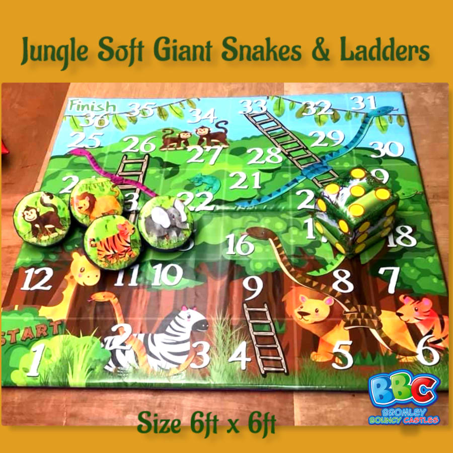 Our Giant Jungle Snakes and Ladders Game is available for hire in various areas, including Bromley, Orpington, Bexleyheath, Croydon, New Addington, Sevenoaks, Beckenham, and more. No matter where your jungle adventure takes place, our team will deliver this larger-than-life game to your location, ensuring a memorable and entertaining experience for everyone involved. See our other themed Snakes and ladders. Always allow 2ft extra in size to be sure.