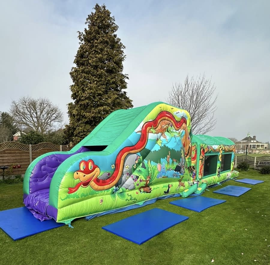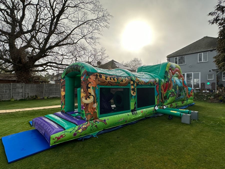 Custom-made with stunning jungle artwork, this obstacle assault course is not only a visual treat but also packed with fun challenges.