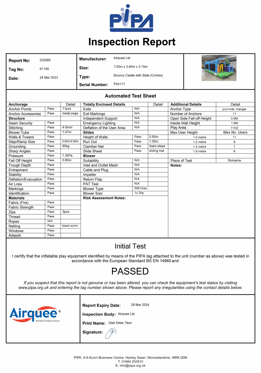 We provide an electric blower and an extension lead when setting up the equipment, the inflatable will be pegged into the grass as standard and one safety mat is supplied If going indoors we will provide sandbags.