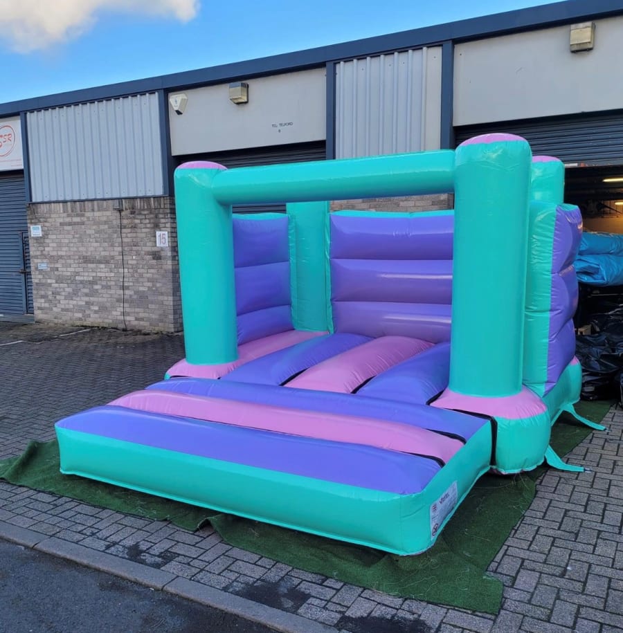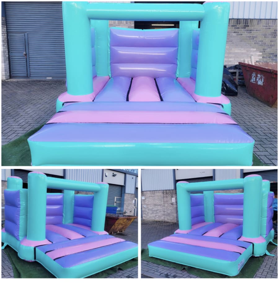 Our amazing pastel mixed colourful kids' bouncy castle combines mint, lilac, and baby pink to create a delightful play environment.