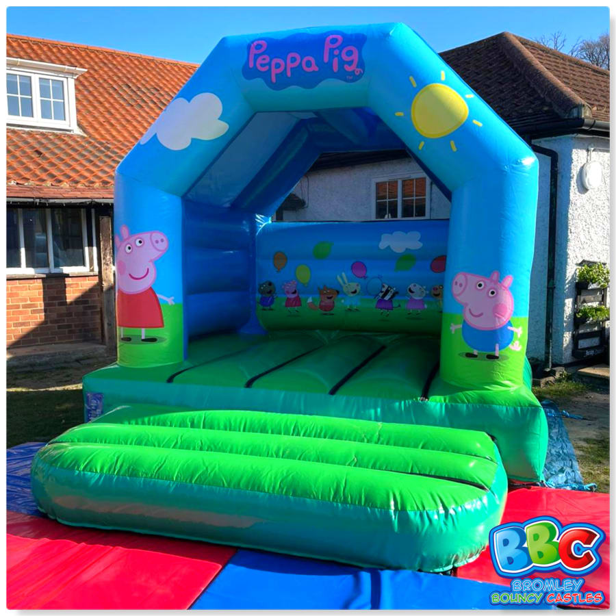 Available for hire throughout a wide area, including Beckenham, Orpington, Sevenoaks, Coulsdon, Croydon, and Bromley, our team ensures prompt delivery and professional setup. The Peppa Pig Green Small Bouncy Castle measures 10ft Wide x 12ft Long and stands 9.5ft High, making it suitable for indoor and outdoor use. It's perfect for kids under 8 years old, with a capacity of around five children at a time. The castle is available in a variety of colors, including pink, green, and blue, and comes equipped with a shower/sun cover, ensuring fun regardless of the weather.