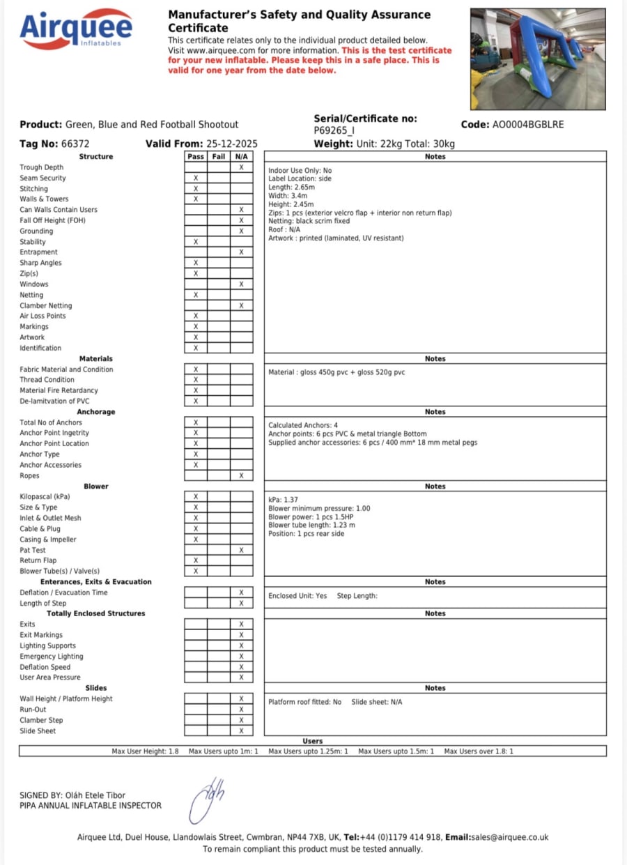 Easily book this inflatable through our live online booking system where you can check availability. To secure your rental, simply click on the green Book Online button below. We provide a hassle-free setup including an electric blower and an extension lead. The inflatable will be securely pegged into the grass or set up with sandbags if indoors, and a safety mat is supplied free of charge.