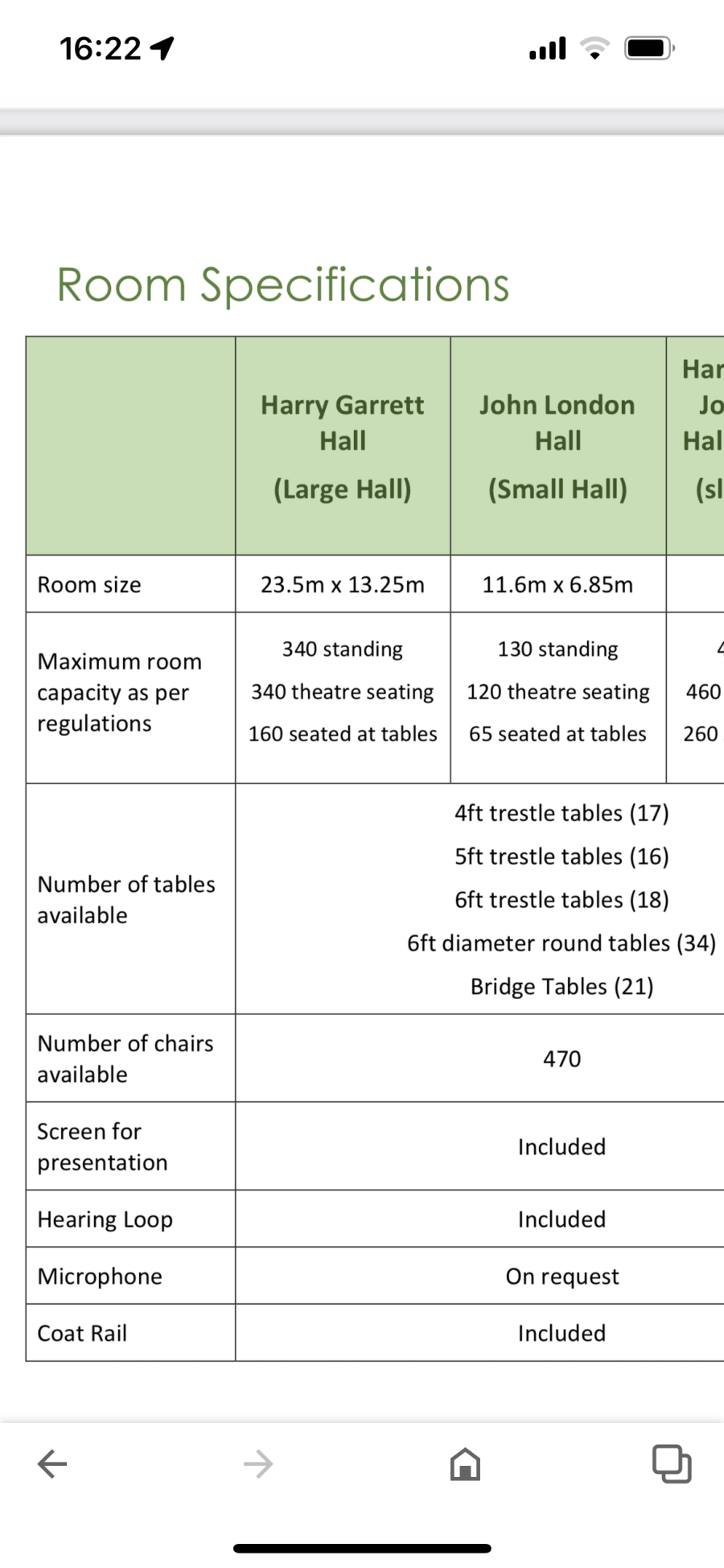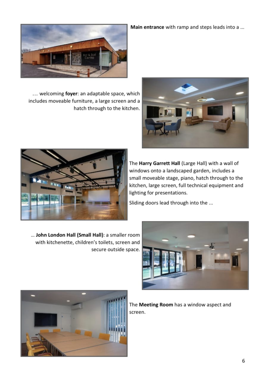 Facilities General and access Two large multi-purpose rooms, which can be hired individually or together, and an additional smaller room. The Centre has level access with push button automatic double doors into the main entrance. An acoustic loop system is fitted in all rooms for those with hearing impairment. Equipment Wi-Fi is available throughout the building and modern audio-visual equipment is available to use. Please see page 7 for audio visual, public address and lighting package prices. Kitchen There is a catering-standard kitchen available for hire. Landscaped garden area Including gazebo with water feature, electricity, large terrace and seating. Multi Use Games Area (MUGA) The MUGA is a fenced-off area with floodlighting, used for playing different sports such as tennis, netball, 5-a-side football and basketball. Opening times are from 6am to 9pm with both pre-booked free and chargeable sessions available. Defibrilator This is located on the outside wall by the front entrance. Parking There are 66 free car parking spaces outside the Centre and 6 disabled parking spaces. An additional 2 spaces will have charging points installed. Cyclists can make use of cycle racks. Public Transport Easy access to Bat & Ball Station southeasternrailway.co.uk thameslinkrailway.com Buses and Go-Coach direct hire service go-coach.co.uk/Timetable For all queries please contact: hallhire@sevenoakstown.gov.uk