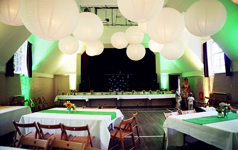 The Main Hall (27ft x 55ft (8.3m x 16.8m)) is a large bright space with wooden sprung flooring marked out for badminton. At one end is a raised stage of 65 sqm, perfect for amateur dramatics, with a manual curtain with stage lighting plugs. At the other end is a store room (adjacent to the kitchen) for chairs which can be used as a bar when empty. This hall is great for all of BJ's Bouncy Castles products that are 14ft high due to ceiling height. Activity castles, pirate ship and soft play packages with super hero themes, princess, unicorns, farm, paw patrol, peppa pig, mickey and friends.