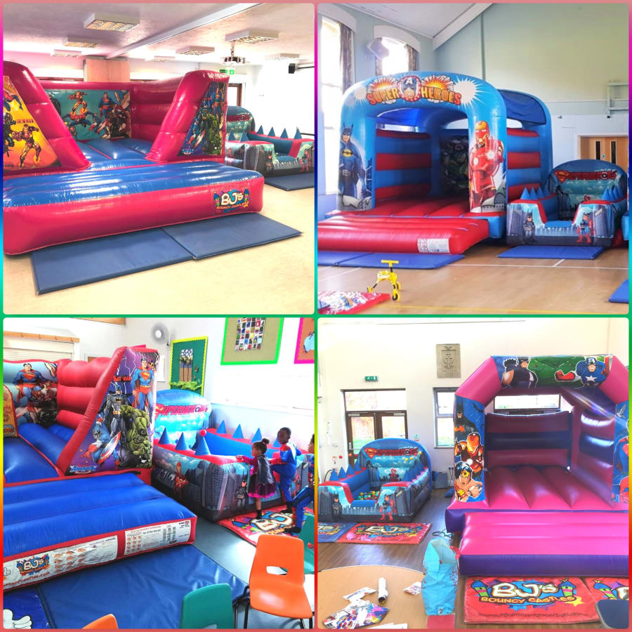 Super Hero Bouncy Castles: Choose between low height for indoor hire or with a roof and rain/sun cover.