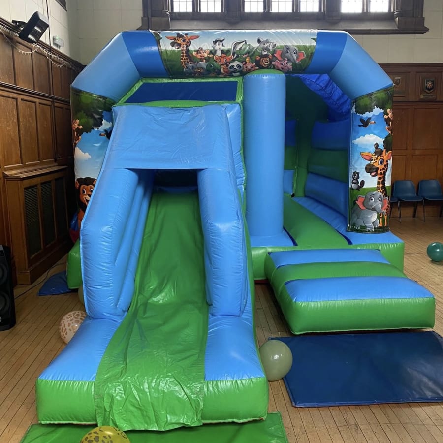 With its compact 13ft x 18ft footprint and 9.5ft height, this jungle-themed inflatable fits beautifully in most gardens or community halls. It offers a generous bounce area and front slide, suitable for up to 6 children at once (depending on height and age). It’s ideal for children aged 10 and under, making it a favourite for birthdays, school events, and toddler-friendly parties.